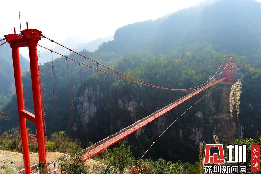 2017年11月5日,游客走在湖北省保康县歇马镇九路寨景区战口河人行悬索桥上观光。