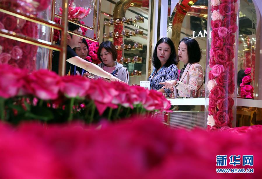 参观者在第二届进博会品质生活展区一家化妆品展台参观(11月6日摄)。新华社记者刘颖摄