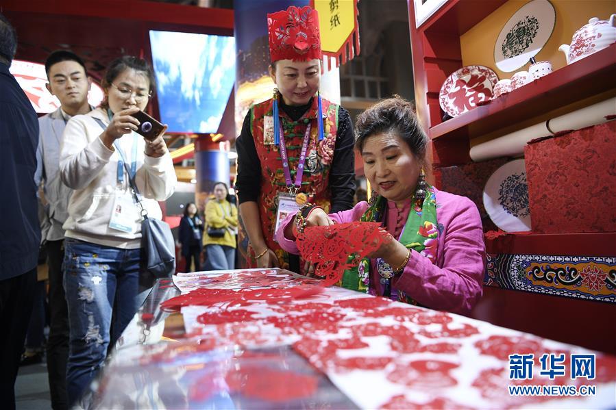 非遗传承人田亚莉(右一)在第二届进博会陕西非遗展区展示剪纸技艺(11月8日摄)。新华社记者王鹏摄