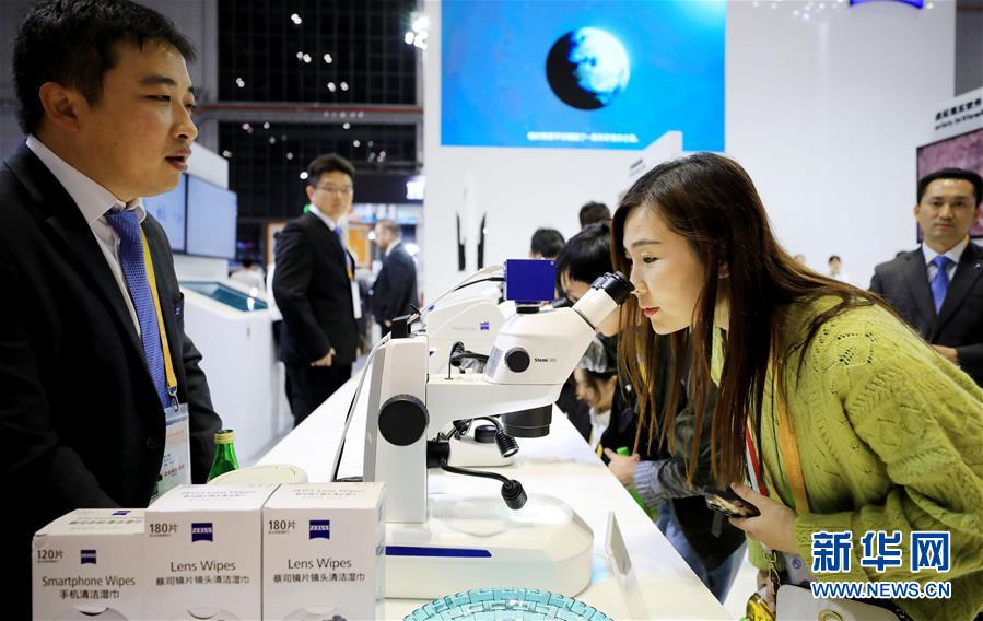 在第二届进博会装备展区德国蔡司公司展台,参观者体验一款数码互动教学系统产品(11月8日摄)。新华社记者方喆摄