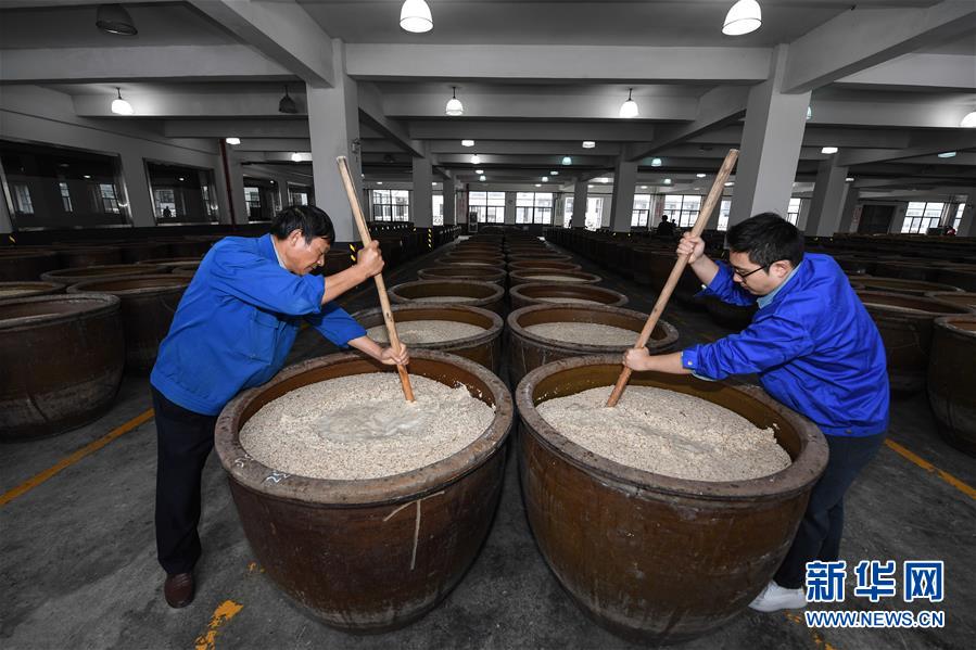 11月7日,古越龙山绍兴酒股份有限公司酿酒一厂的工人进行“开耙”搅拌。新华社记者徐昱摄