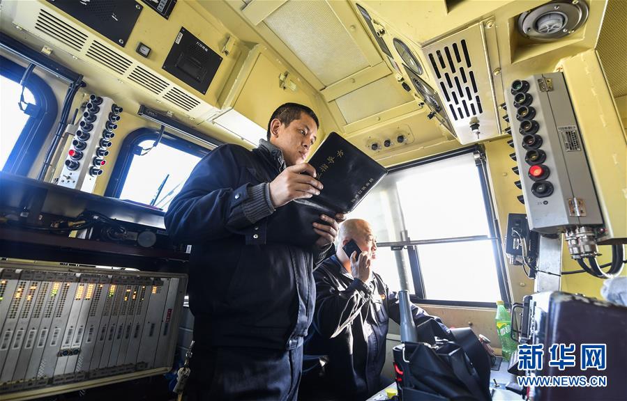 机车司机杜洪峰(右)与副司机谢振国进行开车前的例行检查(1月17日摄)。新华社记者 许畅 摄