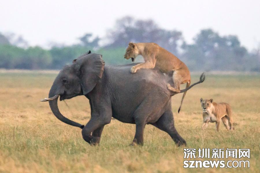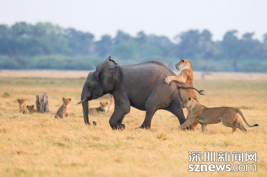 英国摄影师詹姆斯(James Gifford)在博茨瓦纳乔贝国家公园拍到一群狮子猎食大象的精彩画面。在詹姆斯的镜头下,一头母狮跳到了一头小象的背上想要将其拿下,但仅凭一己之力又不能做到。但当母狮的后援抵达时,象群也赶到了现场。最终,小象回到了象群中获得庇护,而狮群也不得不悻悻离去。