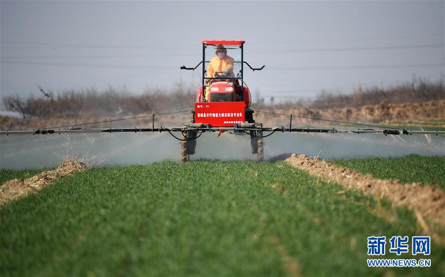 3月4日,建建农机合作社社员在蒲城县椿林镇平峨村驾驶自走式高杆喷雾机为小麦喷洒除草杀菌剂。近日,为确保疫情期间不误农时,陕西省蒲城县植保植检站组织县内7家农作物病虫害专业化防治单位,在小麦返青起身期,对麦田进行除草及病虫害的防控工作。新华社记者李一博摄