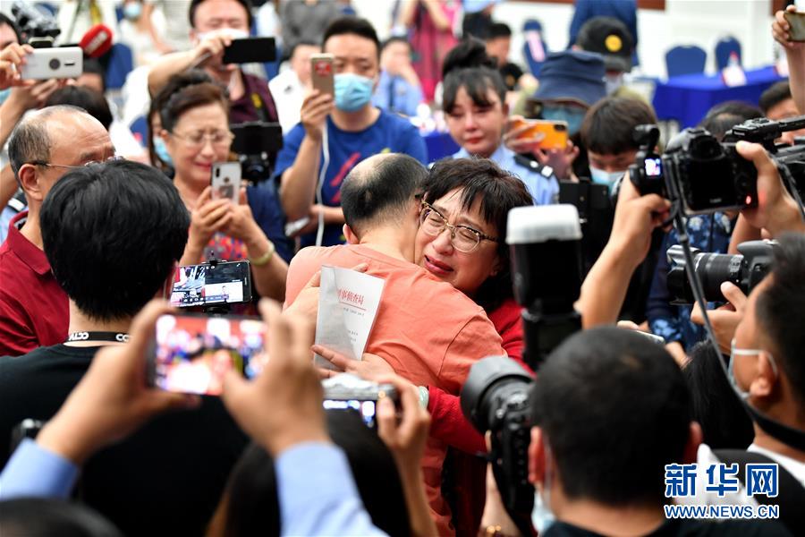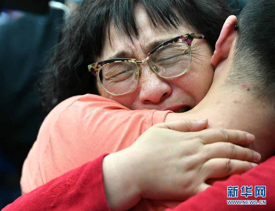5月18日,李静芝与失散32年的儿子毛寅拥抱。新华社记者张博文摄