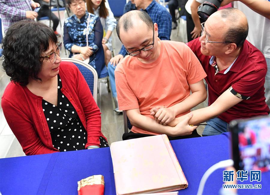 5月18日,李静芝、毛振平(左)与失散32年的儿子毛寅团聚。新华社记者张博文摄