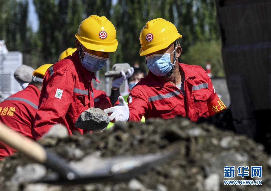 6月22日,应急抢险队员参加演练。当日,新疆维吾尔自治区公路管理局组织的2020年国省干线公路突发地质灾害应急演练在乌鲁木齐举行,演练模拟乌鲁木齐市柴窝堡区域遭受强降雨,诱发附近水域突发洪水,公路路基面临被洪水冲毁的险情,组织抢险人员和机械设备在指定时间内赶赴受灾现场实施应急抢险处置。此次演练将进一步增强各相关部门的防灾减灾意识,提高公路应急抢险处突能力。新华社记者王菲摄