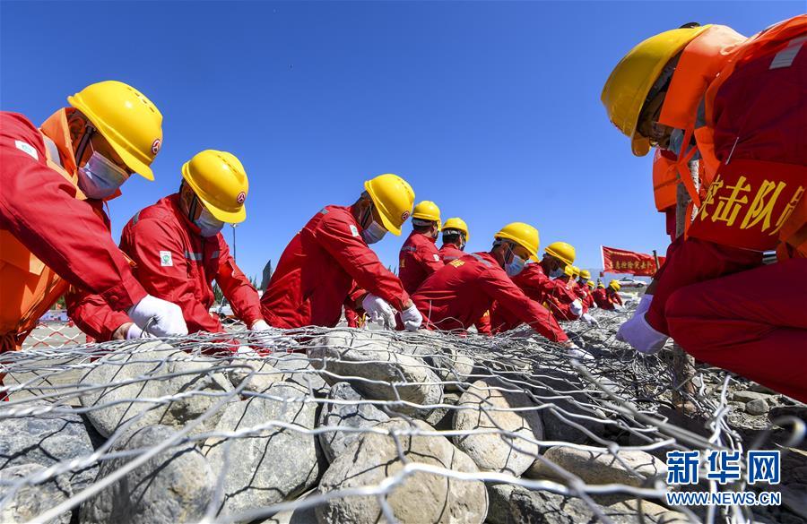 6月22日,应急抢险队员参加演练。当日,新疆维吾尔自治区公路管理局组织的2020年国省干线公路突发地质灾害应急演练在乌鲁木齐举行,演练模拟乌鲁木齐市柴窝堡区域遭受强降雨,诱发附近水域突发洪水,公路路基面临被洪水冲毁的险情,组织抢险人员和机械设备在指定时间内赶赴受灾现场实施应急抢险处置。此次演练将进一步增强各相关部门的防灾减灾意识,提高公路应急抢险处突能力。新华社记者王菲摄