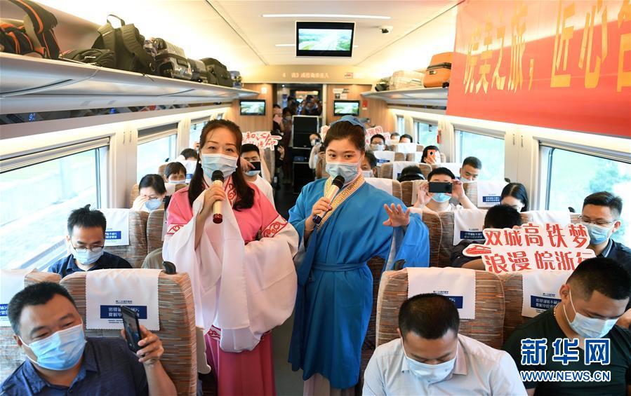 6月28日,合肥客运段工作人员在合肥南至杭州东的G9394次列车上为旅客表演节目。新华社记者刘军喜摄