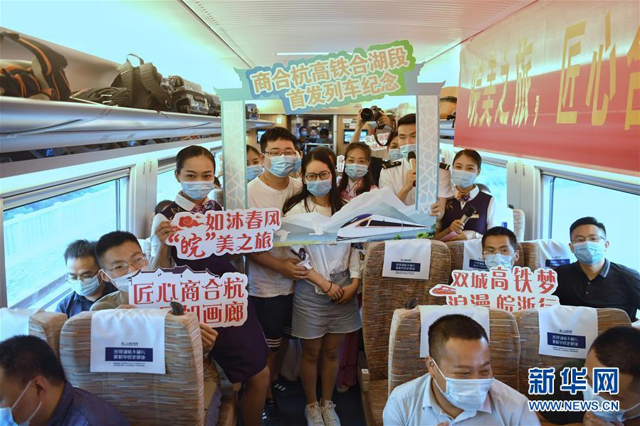 6月28日,在合肥南站,合肥客运段工作人员和旅客在合肥南至杭州东的G9394次列车上合影。新华社记者刘军喜摄