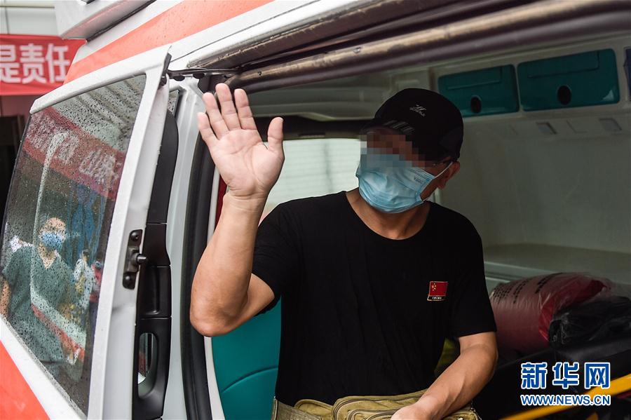 6月29日,在北京地坛医院,患者何先生向医生挥手道别。新华社记者彭子洋摄