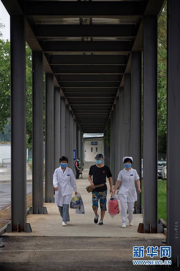 6月29日,在北京地坛医院内,医护人员送患者何先生离开隔离病区。新华社记者彭子洋摄