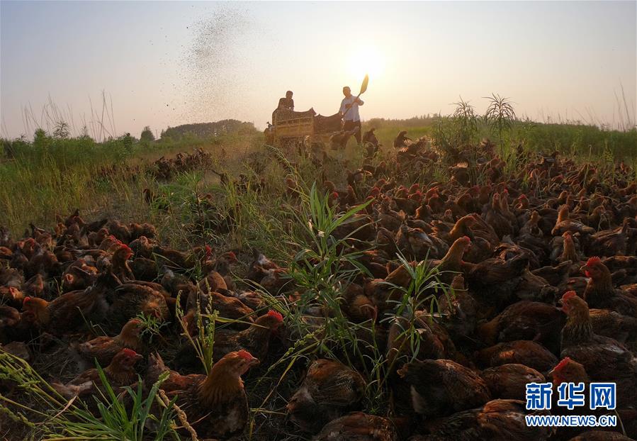 7月1日,在黑龙江省五大连池市的草原上,桑庆军在抛撒饲料喂鸡。新华社记者谢剑飞摄