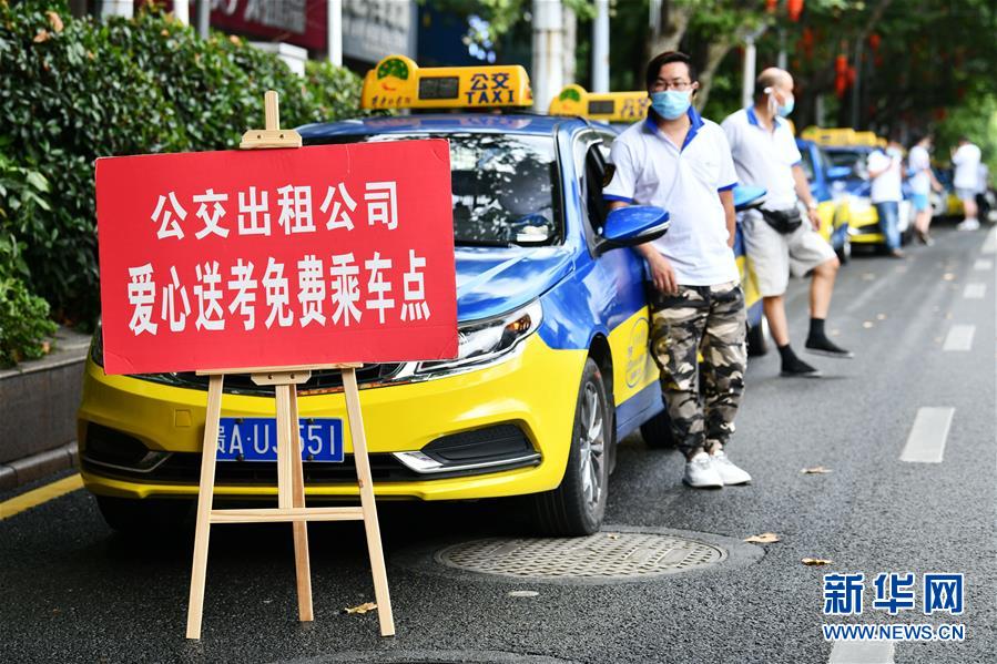 7月7日,在贵州省贵阳市第六中学考点外,爱心送考出租车司机在等候考生结束考试后免费乘车。当日,2020年高考拉开帷幕。新华社记者杨文斌摄