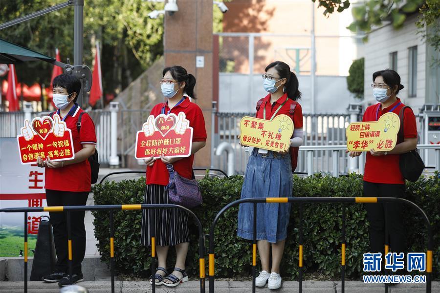 7月7日,在位于北京的中国人民大学附属中学考点外,前来送考的老师举着提示牌送考生进考场。当日,2020年高考拉开帷幕。新华社记者沈伯韩摄
