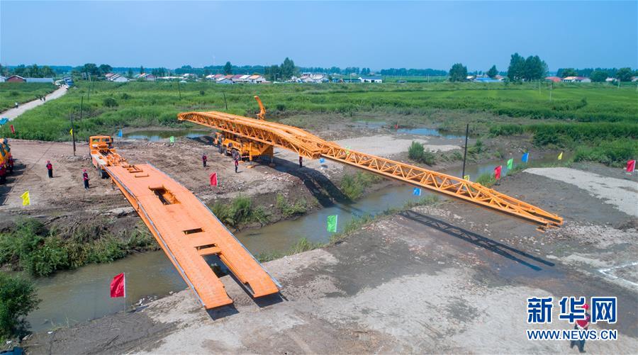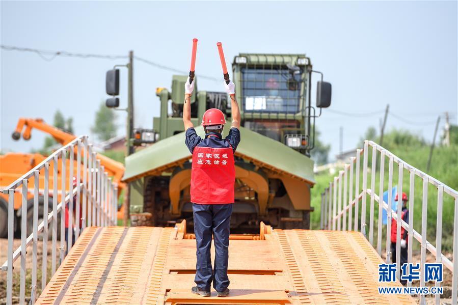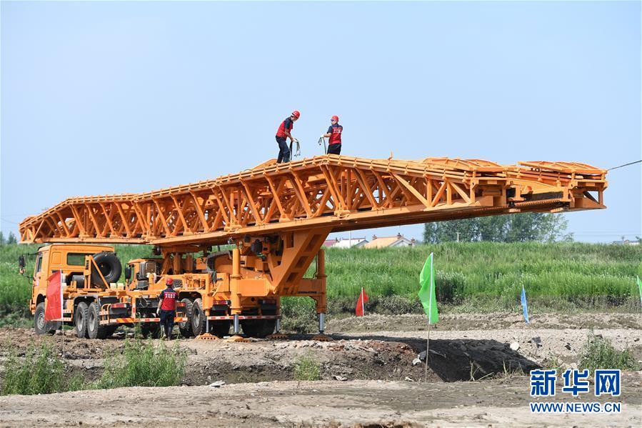 7月10日,工作人员在演练现场搭建机械化桥梁。当日,由吉林省交通运输厅主办的公路桥梁水毁抢通应急演练在长春市双阳区双阳河举行,参与演练人员从汛情水毁信息报送、应急装备快速集结、机械化桥梁抢通搭设、善后处理等方面进行实战演练。新华社记者张楠摄