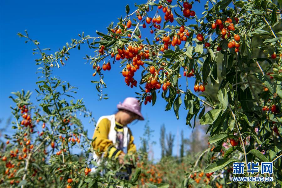 7月13日,在新疆精河县托里镇的一处枸杞种植园,村民在采收枸杞。近日,新疆精河县10万余亩枸杞陆续成熟,当地农民抢抓农时,采收枸杞。近年来,精河县持续发展和培育枸杞“红色产业链”,加大资金扶持力度,提升精河枸杞的品牌效应,带动农民增收致富。精河县位于新疆天山山脉北麓,准噶尔盆地西南边缘。当地日照时间长、昼夜温差大且气候干燥,有利于枸杞果实糖分和药用成分积累。新华社记者 胡虎虎 摄