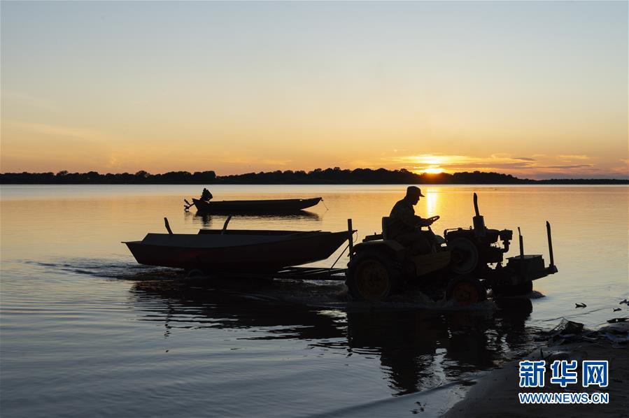 7月24日,渔民在大力加湖中捕鱼归来。大力加湖位于“中国东极”黑龙江省抚远市,面积28.5平方公里,两岸地势低平,多湿地、草原,湖内水产丰富。夏日傍晚时分,渔民捕鱼归来,美丽画卷映入眼帘。新华社记者谢剑飞摄