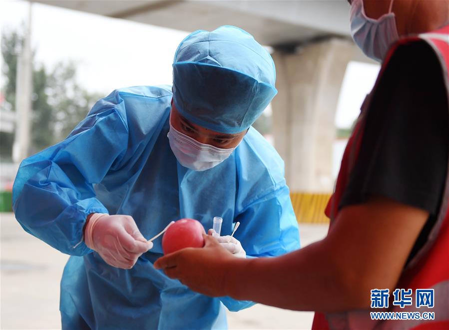 工作人员在新发地批发市场周转新区对进场蔬果进行取样(8月6日摄)。 新华社记者 张晨霖 摄