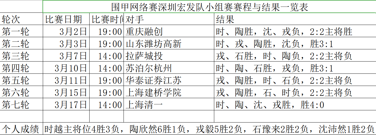附1:《围甲网络赛深圳宏发队小组赛赛程与结果一览表》