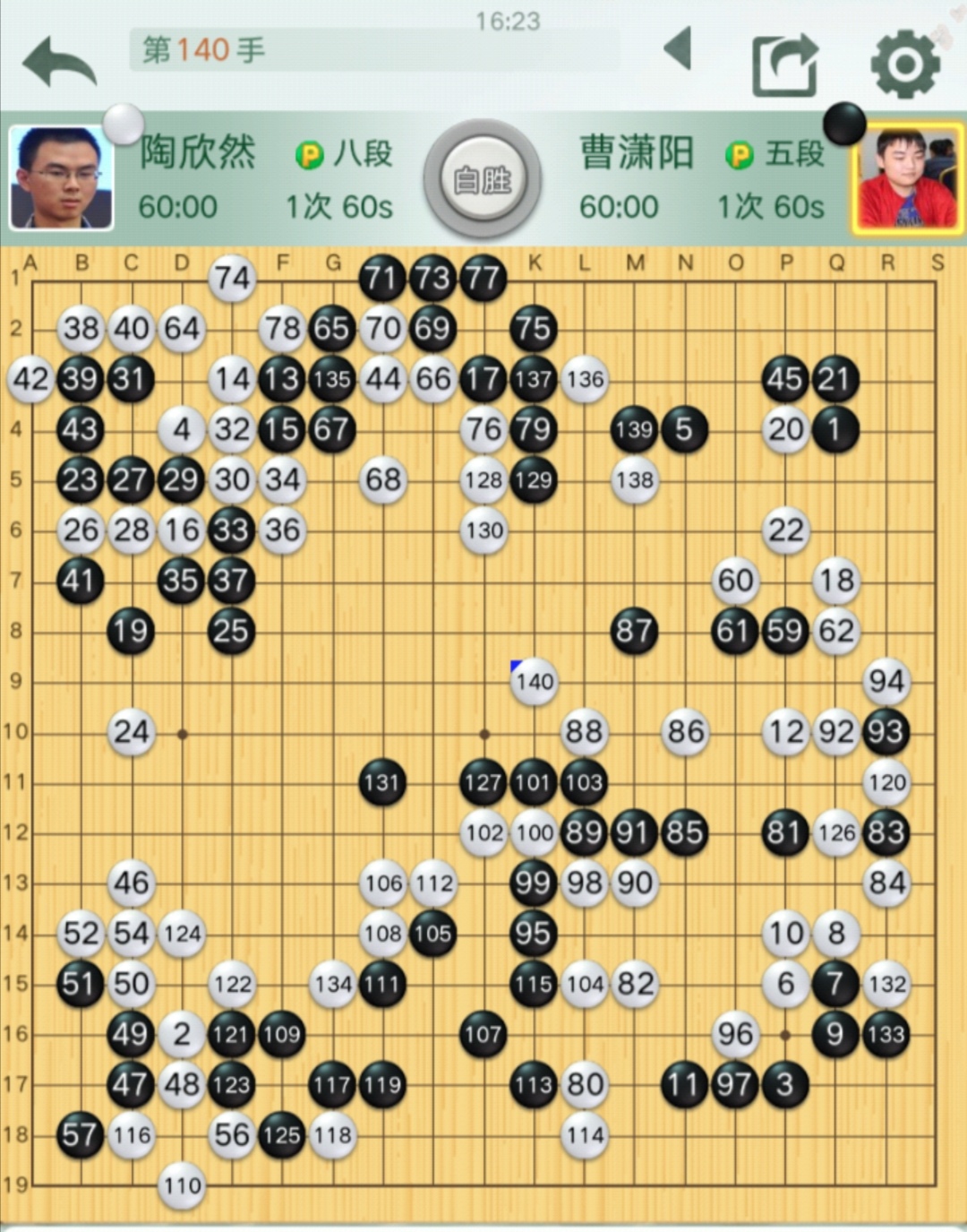 陶欣然自评:布局阶段至44的转换差不多。黑63动出至79收获不大,白方确立优势。白116吃住左下角后领先不少了。