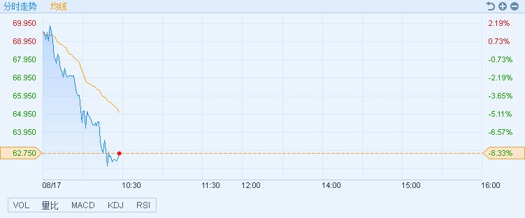智通财经APP获悉,受产业政策影响,医药股普跌,药明生物(02269)领跌板块,连续三个交易日下挫,跌逾两成。截至10时26分,跌8.33%,报价62.75港元,成交额2.27亿。