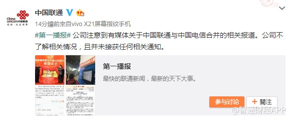 智通财经APP获悉,中国联通在微博发布声明称,公司注意到有媒体关于中国联通与中国电信合并的相关报道,不了解相关情况,且并未接获任何相关通知。