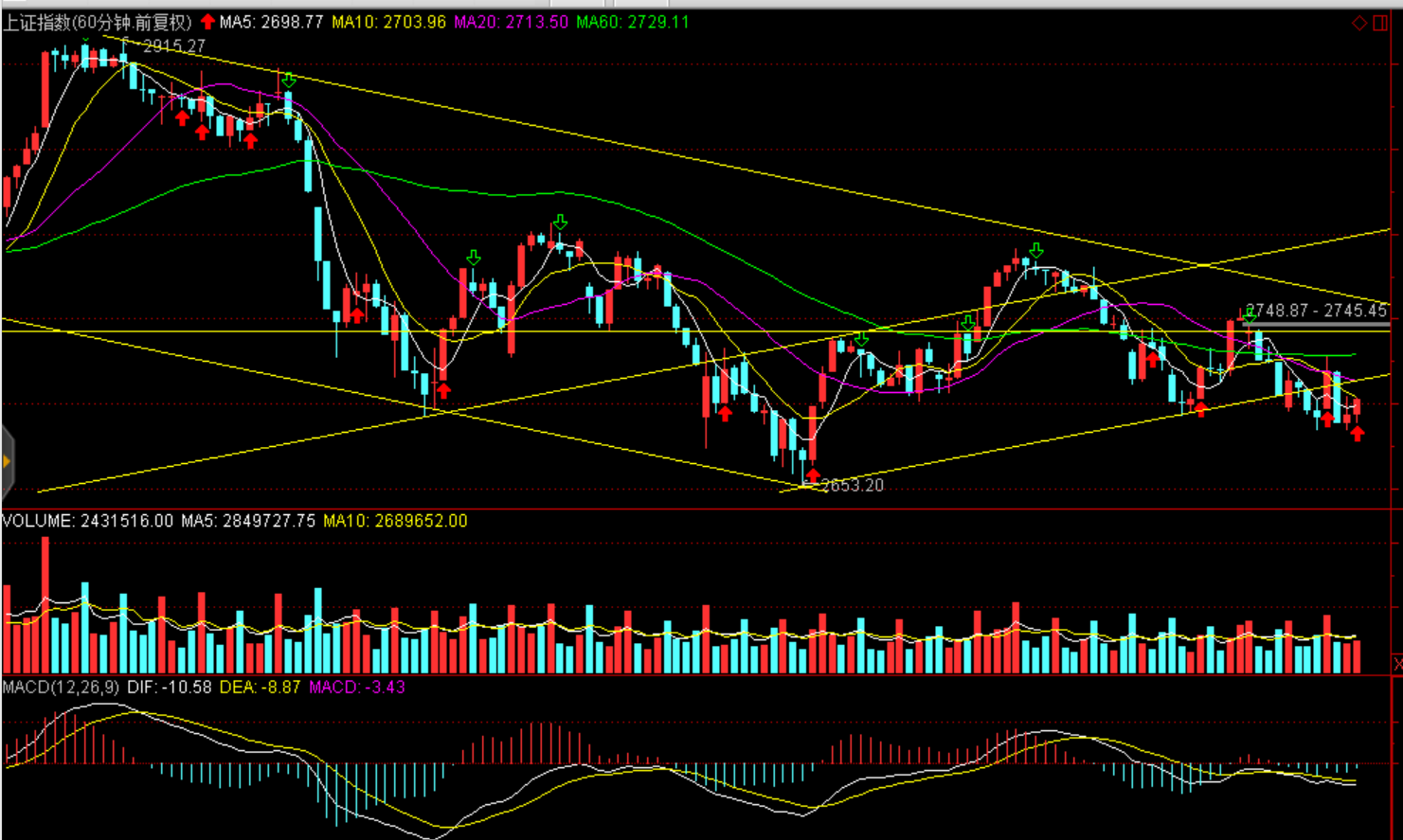 操作建议:中期方向尚不明朗,短期小幅震荡(沪指2700---2750点、创业板1400--1450点区间),在此区间适度短线高抛低吸。