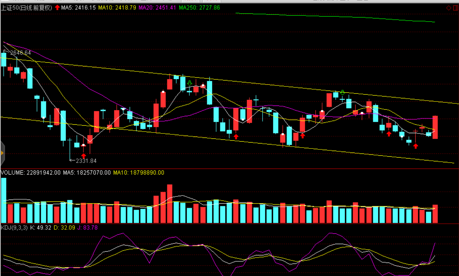 技术面:股指日线、60分钟KDJ均现金叉,短期超跌反弹,20日均线构成沪综指、创业板反弹压力,上证50于2480点一线构成短期压力。
