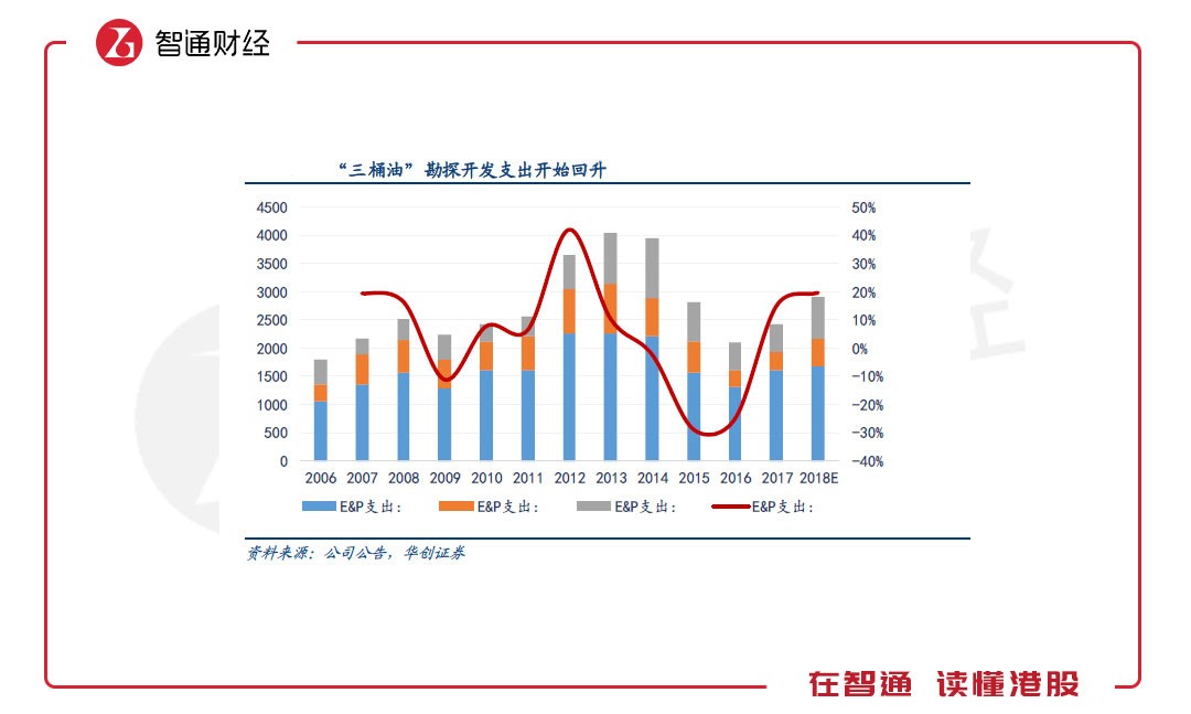 截至2018年,“三桶油”公告用于勘探、开发的资本支出回升至2911亿元,相对2016年已实现38%增长,但仍旧远低于行业高点水平,有巨大上升空间。