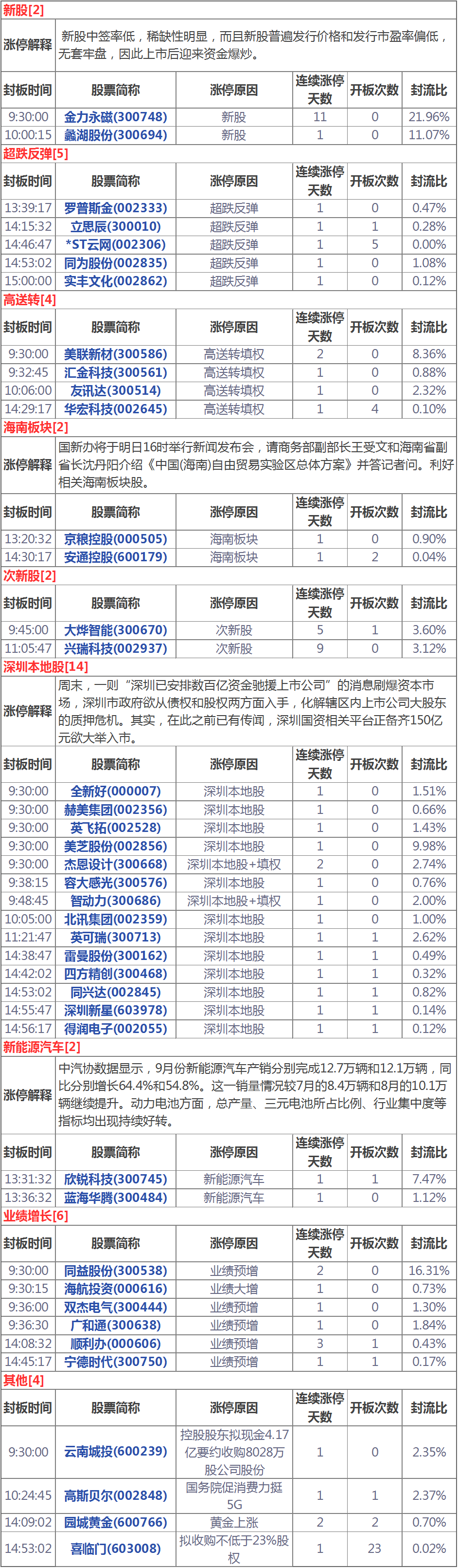 今天涨停家数较上一交易日有所增加,两市41家涨停,跌停40家。成交量方面,沪市成交1428亿元,深市成交1661亿元,两市总成交额约为3089亿元,较上一交易日缩量498亿元。盘面上,银行、白酒、钢铁等板块涨幅靠前,彩票、环保工程、种植业等板块跌幅居前。