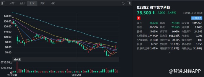 截至今日收盘,舜宇光学科技(02382)报78.5港元,跌2.48%。(张佩暄)