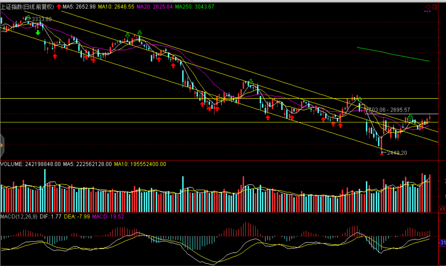 技术面:上周周线量价配合震荡上扬趋势,自10月19日见底以来运行21个交易日,短期指数仍有反复上扬需求,本周20周均线面临压力(沪综指2700点一线、创业板1430点一线)。