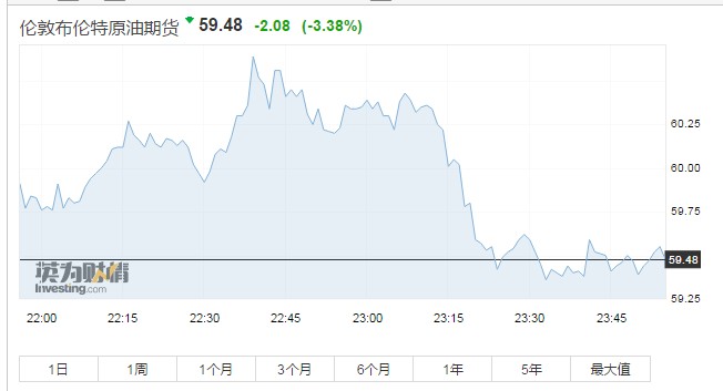 布伦特原油期货报59.48美元/桶,跌3.38%。