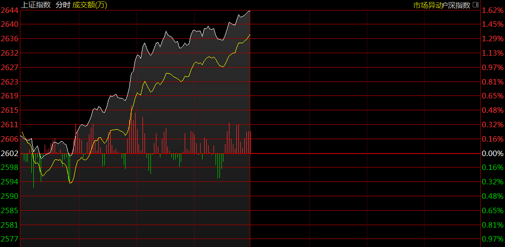 云财经2018年12月13日讯 截至早盘收盘,上证指数报2643点,涨1.60%;深证成指报7844点,涨1.90%;创业板指数报1356点,涨1.35%。盘面上,板块全面上涨,高铁、水泥、家电、机场航运等板块逆势上涨。