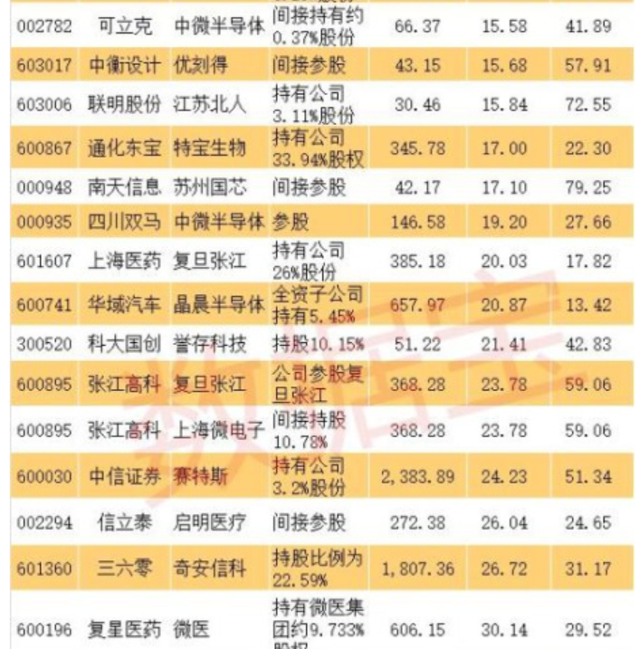 科创板影子股:首批创业板潜在公司背后有超过50只影子股,而这些影子股大多是间接持股。从持股比例来看,最大的是金固股份,持有泰恩达100%股权。其他影子股持股比例较大的还有,通化东宝持有33.94%特宝生物、上海医药持有26%复旦张江、三六零持有22.59%奇安信科、张江高科间接持有10.78%上海微电子、绿地控股持有13%深兰科技、力源信息持有10.8%云汉芯城、科大国创持有10.15%誉存科技、南京高科持有8.65%赛特斯、骆驼股份持有6.25%金达莱等。