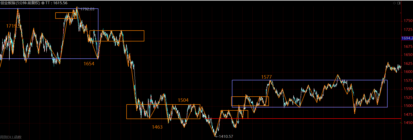 创业板这里在构建30分钟级别的三买,周一如果不跌破1577点,这里将是创业板主升行情的起点。如若重新跌回中枢内部,则按中枢震荡处理。创业板走势要强于主板很多,后续行情多半仍然围绕创业板展开。