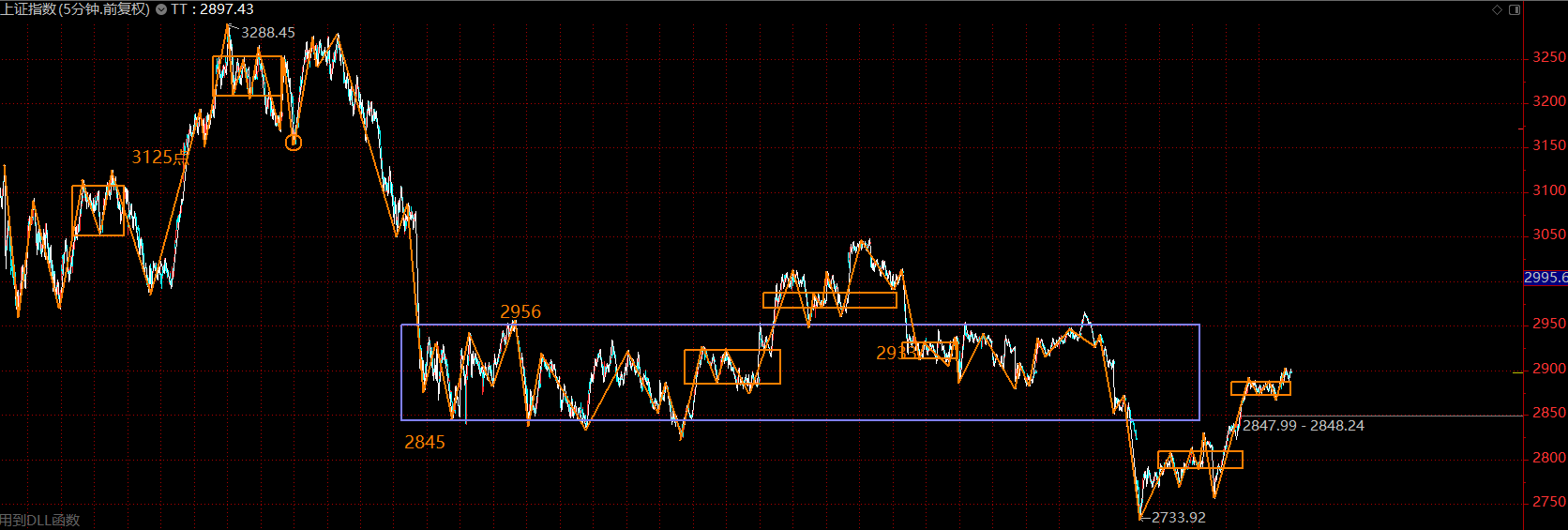 结合周五盘后的消息,这里五分钟的上涨趋势应该已经结束,市场强于预期,并没有在中枢下方结束这段上涨趋势,而且在中枢的中部,回落后,如果不创新低,则构成大级别的二买,中期大行情可期。短期这里可能会面临一波回落,周一早盘如果开在2845上方,则可持股不动,如果低于2845点,则可在上拉时适度减仓,后续在2733与2800之间择机回补。