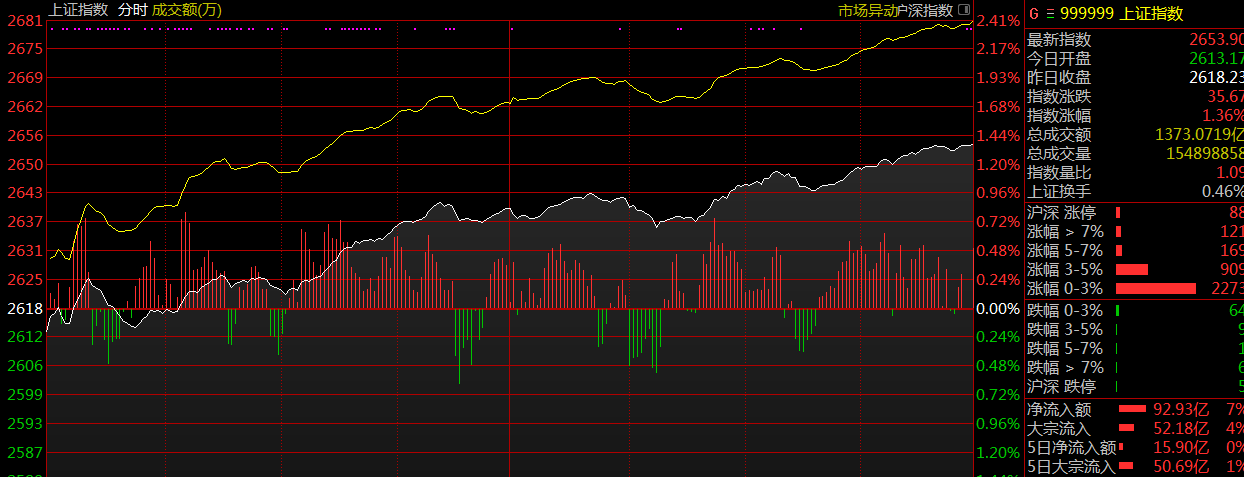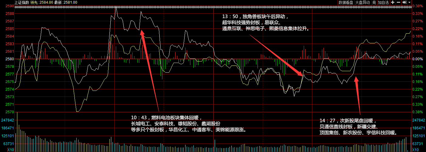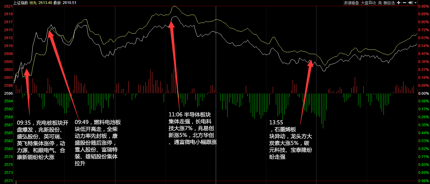 两市今日平开,随后氢燃料电池、券商板块攻势再起推动指数冲高,早盘两市震荡走强。午后指数持续拉升,大消费板块崛起,白酒板块受资金追捧领涨市场,市场人气比较活跃。