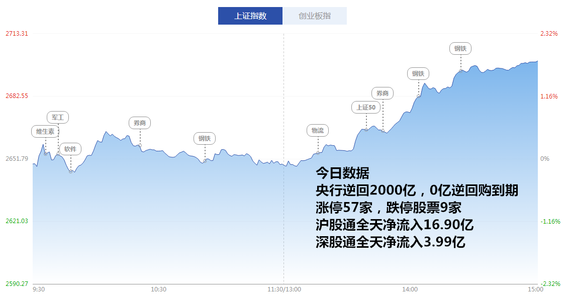今天涨停家数较上一交易日有所增加,两市57家涨停;跌停9家。成交量方面,沪市成交1130亿元,深市成交1406亿元,两市总成交额约为2536亿元,较上一交易日放量469亿元。
