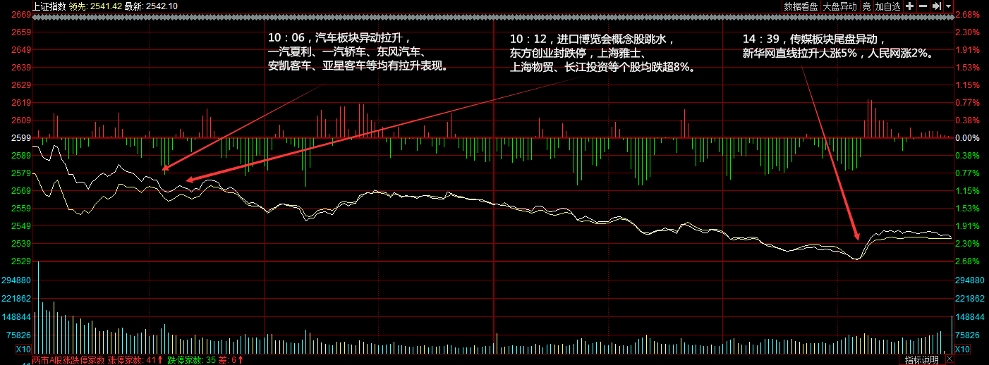 今天涨停家数较上一交易日有所减少,两市41家涨停;跌停35家。成交量方面,两市总成交额约为2554元,较上一交易日缩量272亿元。盘面上,板块多数收绿,白酒、旅游、煤炭、自由贸易港等板块跌幅居前。