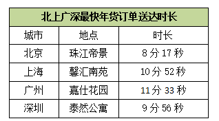 11.平均不出50分钟,消费者就能收到最新鲜的年货,年货订单最快8分17秒送到家。