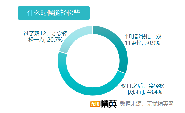忙碌是工作的常态,双11只是更忙一点罢了。48.4%的受访者表示双11以后,会轻松一段时间;30.9%的职场精英表示,平时都很忙,只是双11更加忙碌罢了;而20.7%的人,要过了双十二才会轻松一点。年底的市场,一直是商家们的战场,双11以后,双12、圣诞节、元旦、春节接踵而至,轻松只是短暂的停留,促销才是长期的工作。