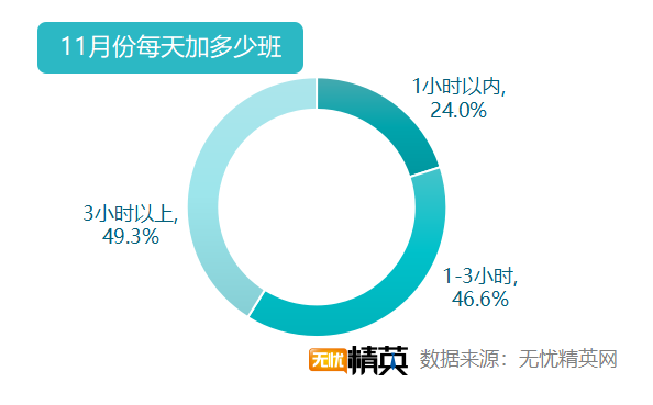 因为双11而加班的职场精英中,有49.3%的人,11月上旬平均每天需要加班3小时以上,别人忙着购物,而他们忙着加班;46.6%的人,加班时间1-3小时;24%的人,每天加班时间在1小时以内。双11的前两天往往是最紧张的,今年恰好是周末,加班也由晚上加班,变成了全天加班,从业者更是辛苦一些。