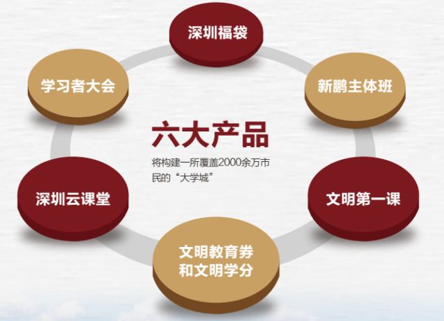 我们以构建一个覆盖2000余万市民的终身学习平台、将深圳市打造成一个培养现代文明市民的“大学城”为愿景,推出新版深圳福袋、新鹏主体班、文明第一课、深圳云课堂、学习者大会等产品。