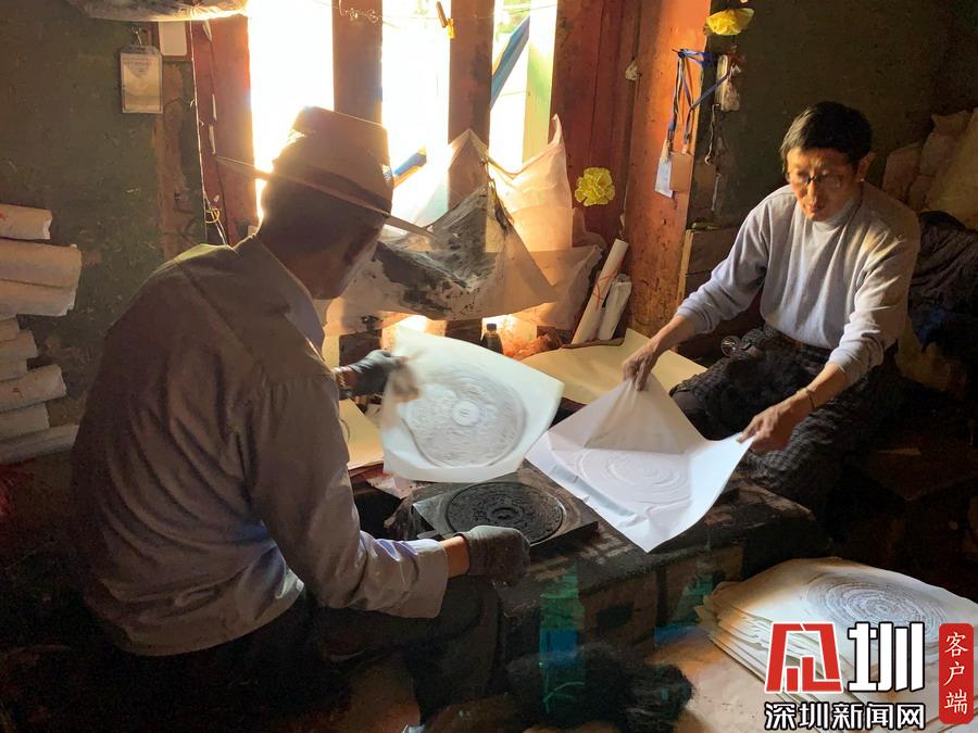 上述工序既是流水作业,又相互交叉,有条不紊。印刷是整个生产工艺流程中工人负荷较重、工序相对较多的关键部分,主要在印经院的二楼。印刷工由两人一组,一高一矮相对而坐,印版就放置在两人之间的斜板上。李仁奇摄
