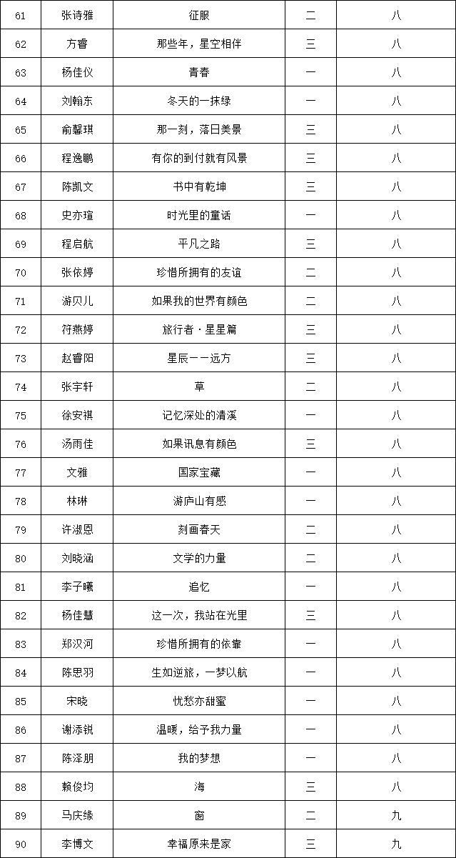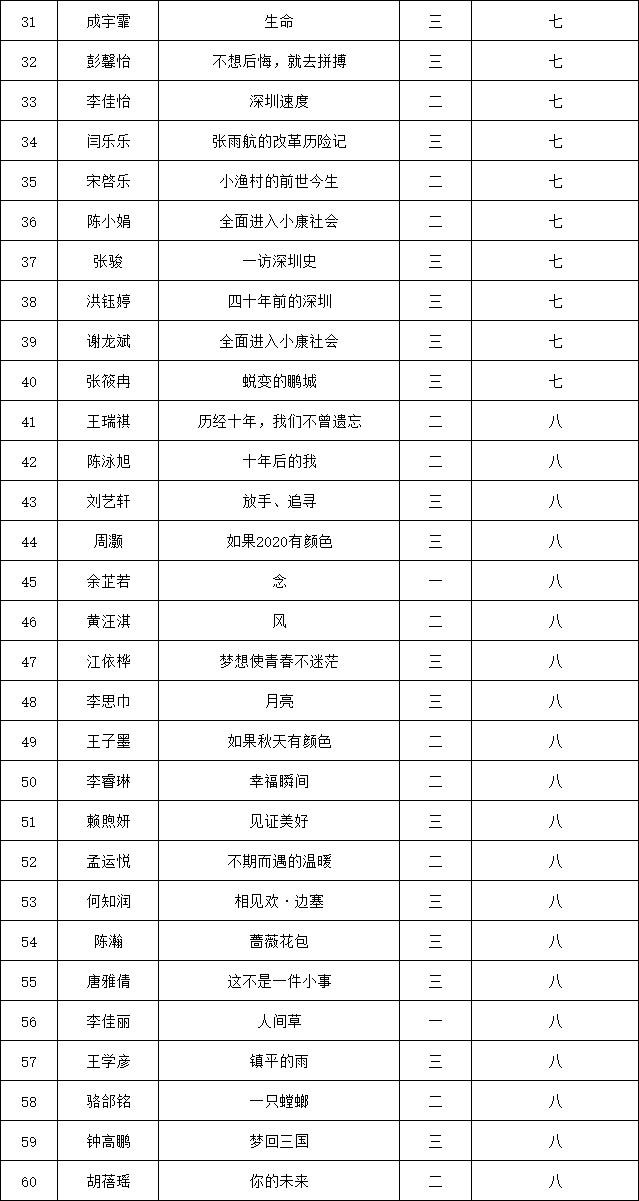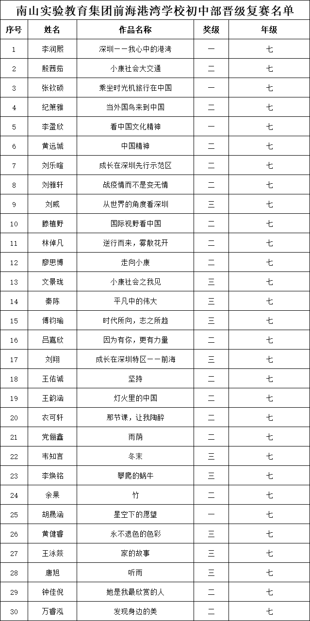 自2021年1月,活动征稿启动以来,获得了深圳市广大中小学生、教师、文学爱好者的热烈响应积极参与,吸引了深圳百余所学校的上万人关注报名。现公布南山实验教育集团前海港湾学校(初中部)专场晋级复赛名单如下: