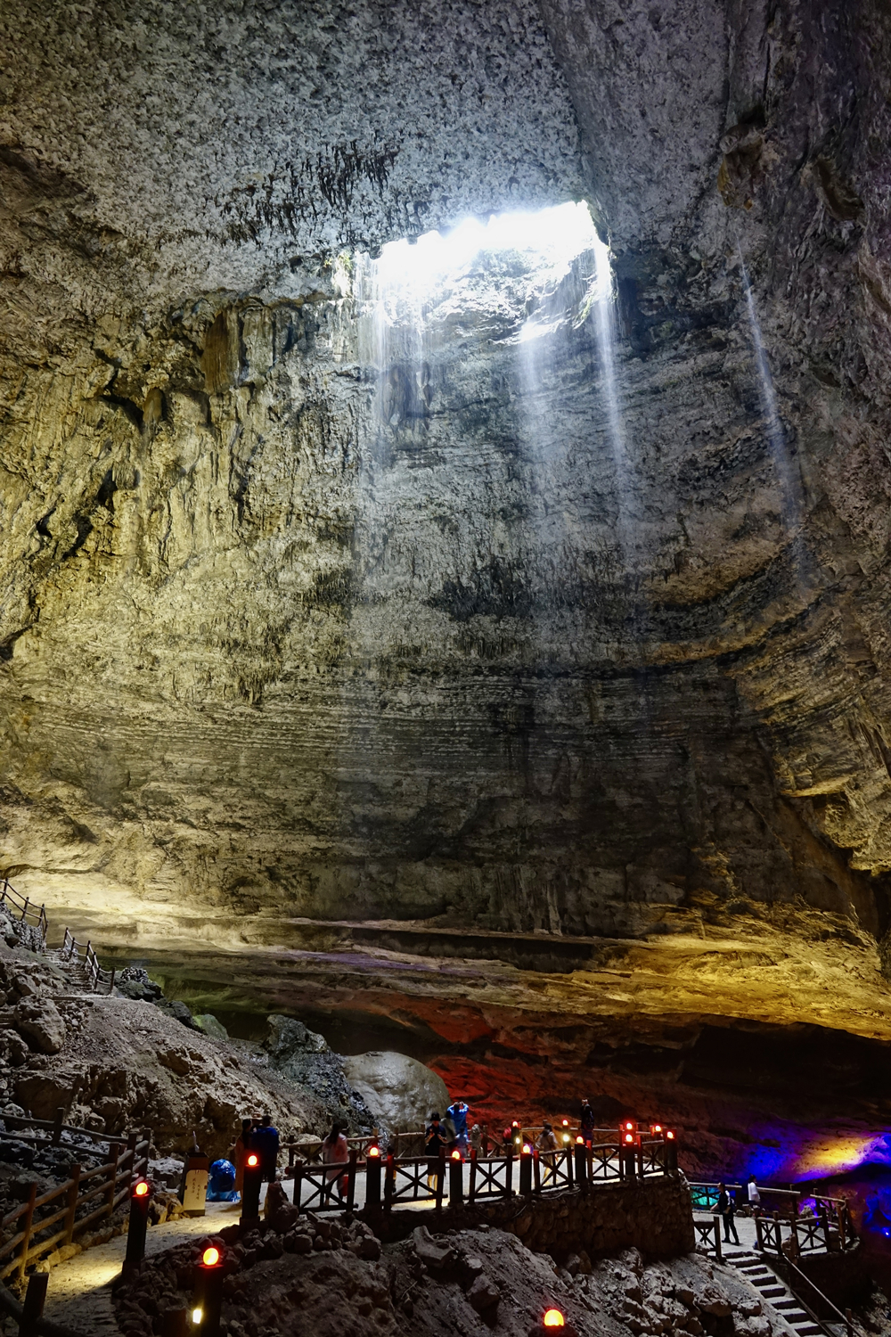 天坑是喀斯特地貌中的一种,它的形成是因为水不断侵蚀固体基岩,使溶洞顶部发生坍塌,最终在地表形成一个巨大的深坑,这个深坑就被称为天坑。李仁奇 摄