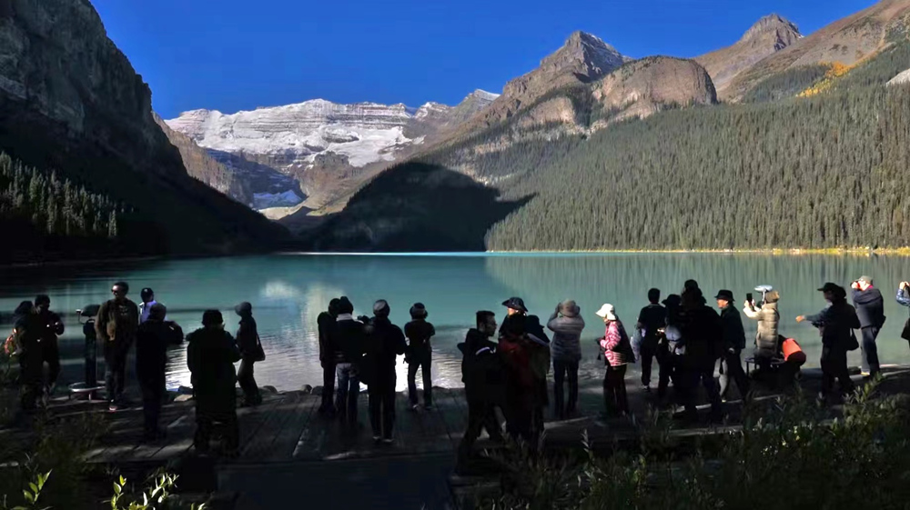 露易斯湖源自维多利亚冰川,湖水碧绿清澈,远望就像镶嵌在落基山脉中的一颗翡翠。李仁奇 摄