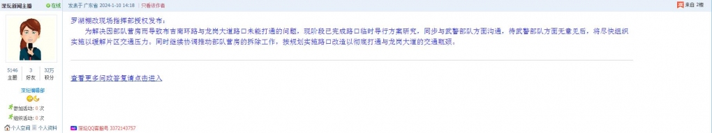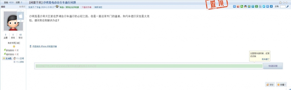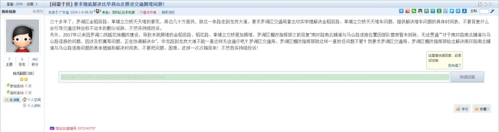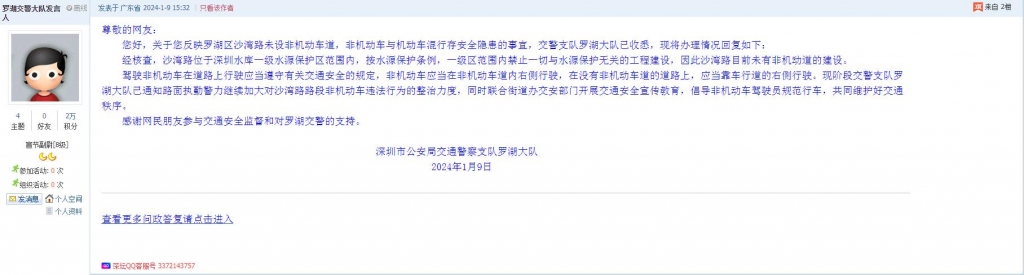各职能单位如需对网友反映的问题进行回应,可在深圳论坛注册官方账号并通过认证,回帖进行回应。